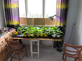 Nu ser mina fönster i prediksalen ut så här. Många krukor med många små hibiskusar och några lite större. Om några veckor ska alla ut i växthuset och få den årliga tillväxtboosten. Då blir det tomt i prediksalen och jag får gå ut för att njuta av dem. De brukar dra igång och blomma när de kommer ut och det ser jag fram emot. Några av dem vet jag inte ens hurdana blommor de får. En överraskning.